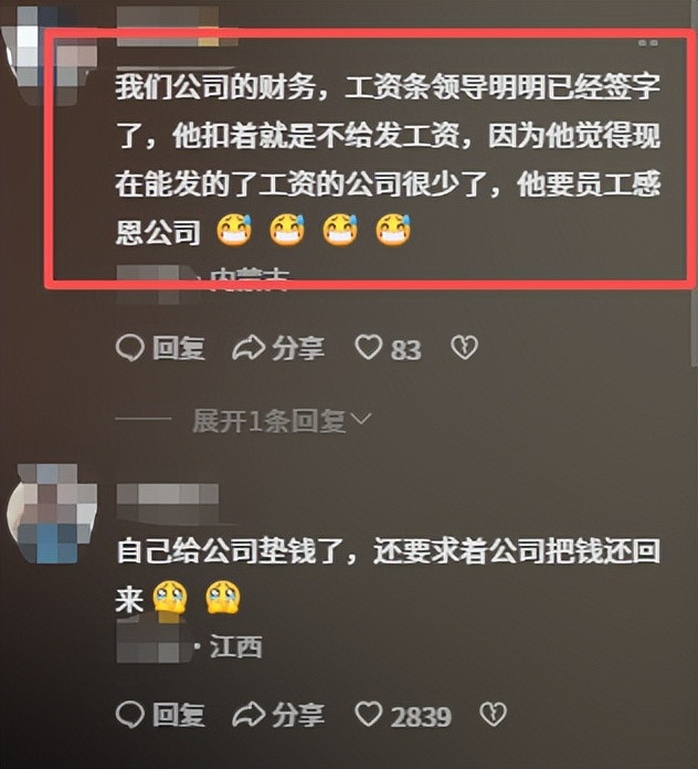 网友:我们公司的财务,工资条领导明明已经签字了,他扣着就是不给发工资,因为他觉得现在能发的了工资的公司很少了,他要员工感恩公司。