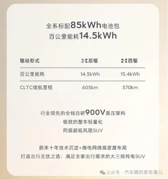 动力方面,新车拥有全域900V三电技术,并会推出后驱以及四驱版车型,后驱版车型电机最大功率340kW,四驱版车型前、后电机最大功率分别为100/340kW。动力电池将会全系标配85kWh电池,后驱版本CLTC 百公里能耗低至14.5kWh,四驱版本为15.4kWh,对应的续航里程分别为 570km和605km。